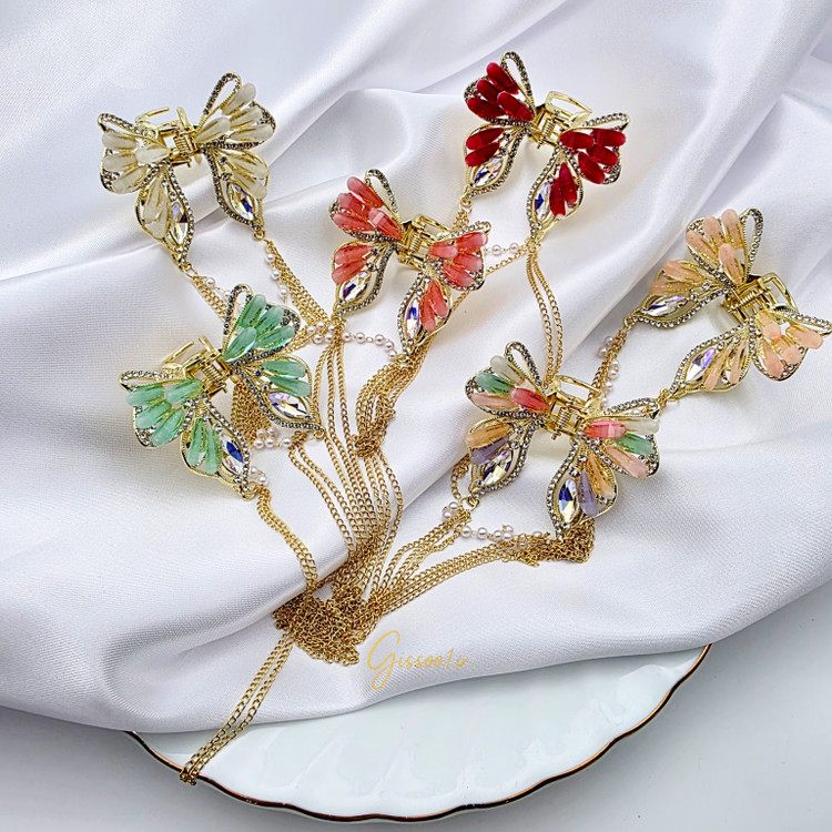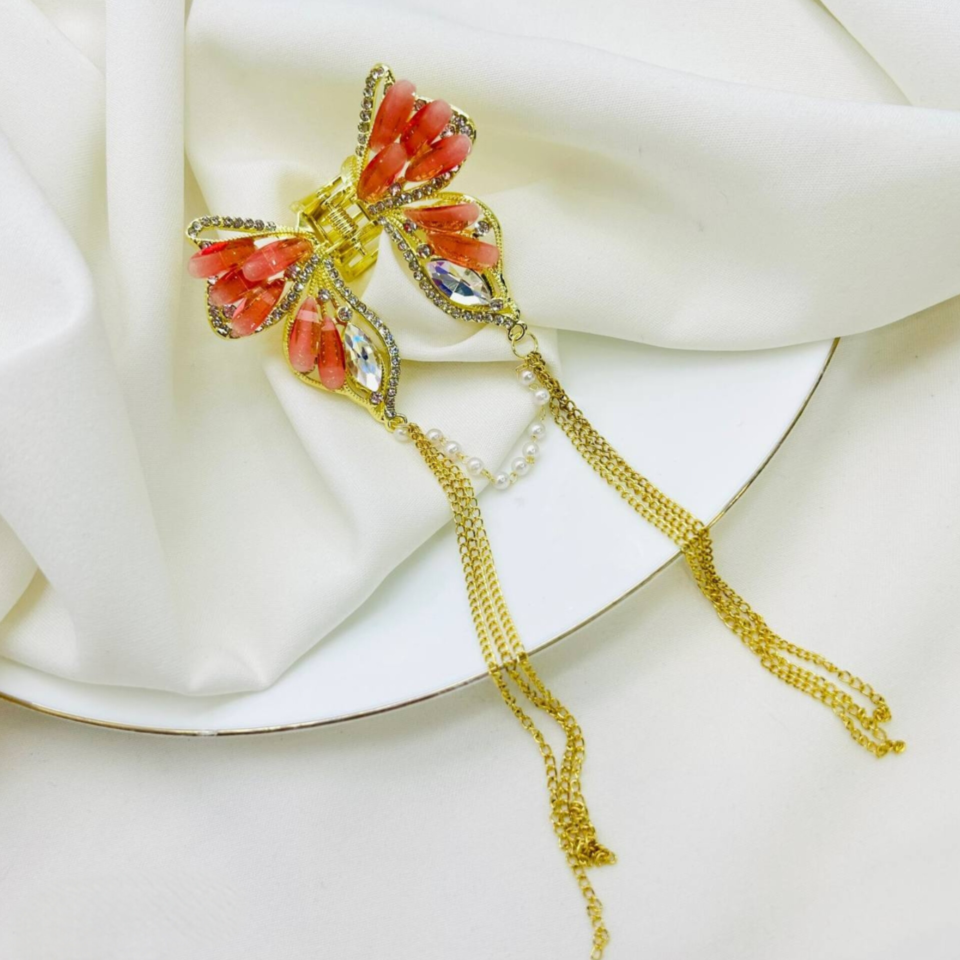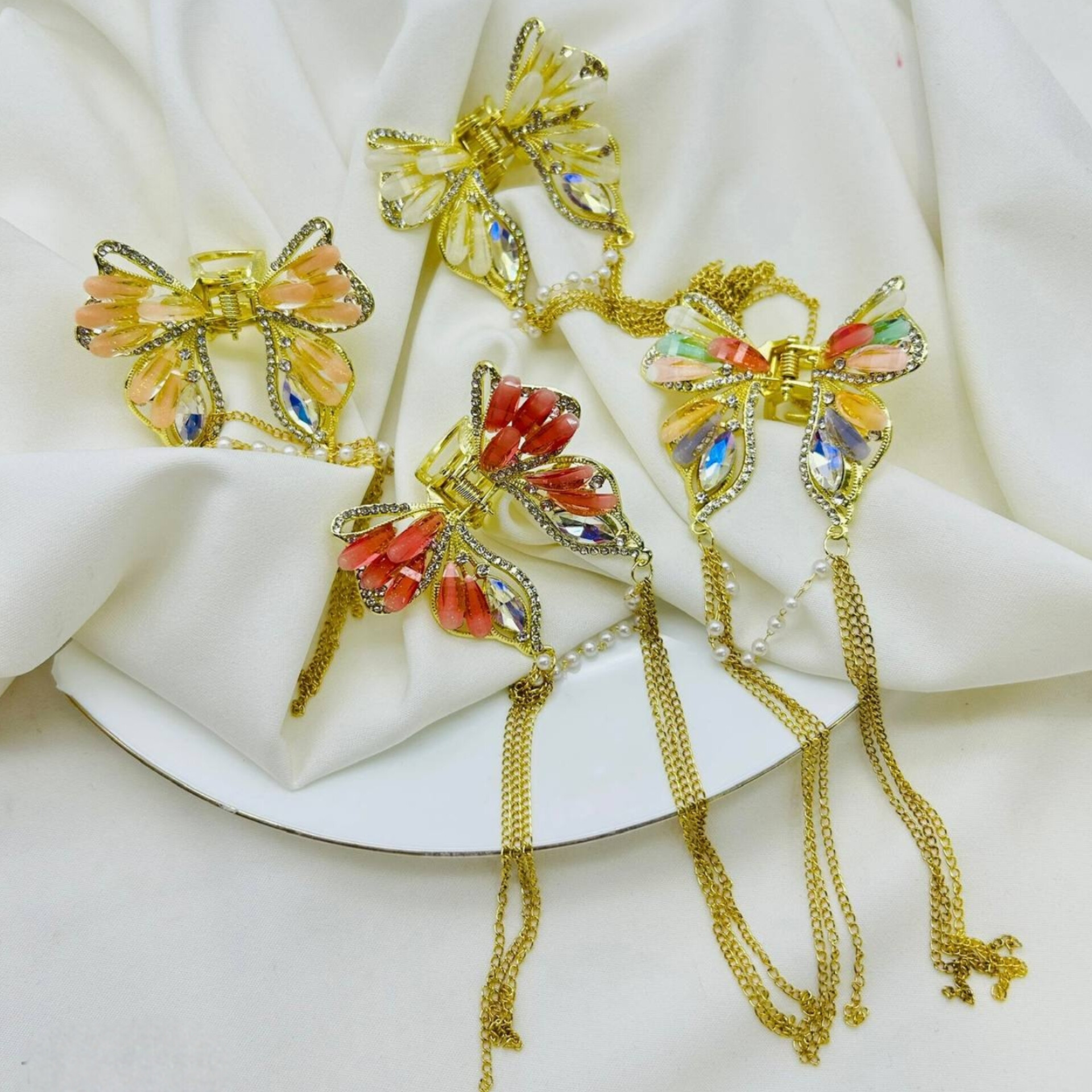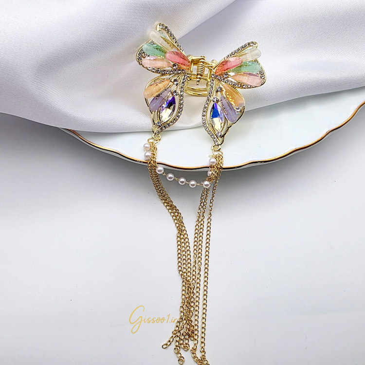 کلیپس مو پروانهای طلایی با طراحی ظریف و تزئینات رنگی، یکی از زیباترین و چشمنوازترین اکسسوریهای موجود در بازار است. بدنه فلزی طلایی آن با بالهای شفاف در رنگهای صورتی، قرمز، زرد و سبز، جلوهای فانتزی و زنانه به استایل مو میبخشد. نگینهای درخشان و آویزهای مرواریدی و زنجیری، این کلیپس را به انتخابی خاص برای مجالس، جشنها و عکاسی تبدیل کردهاند.
