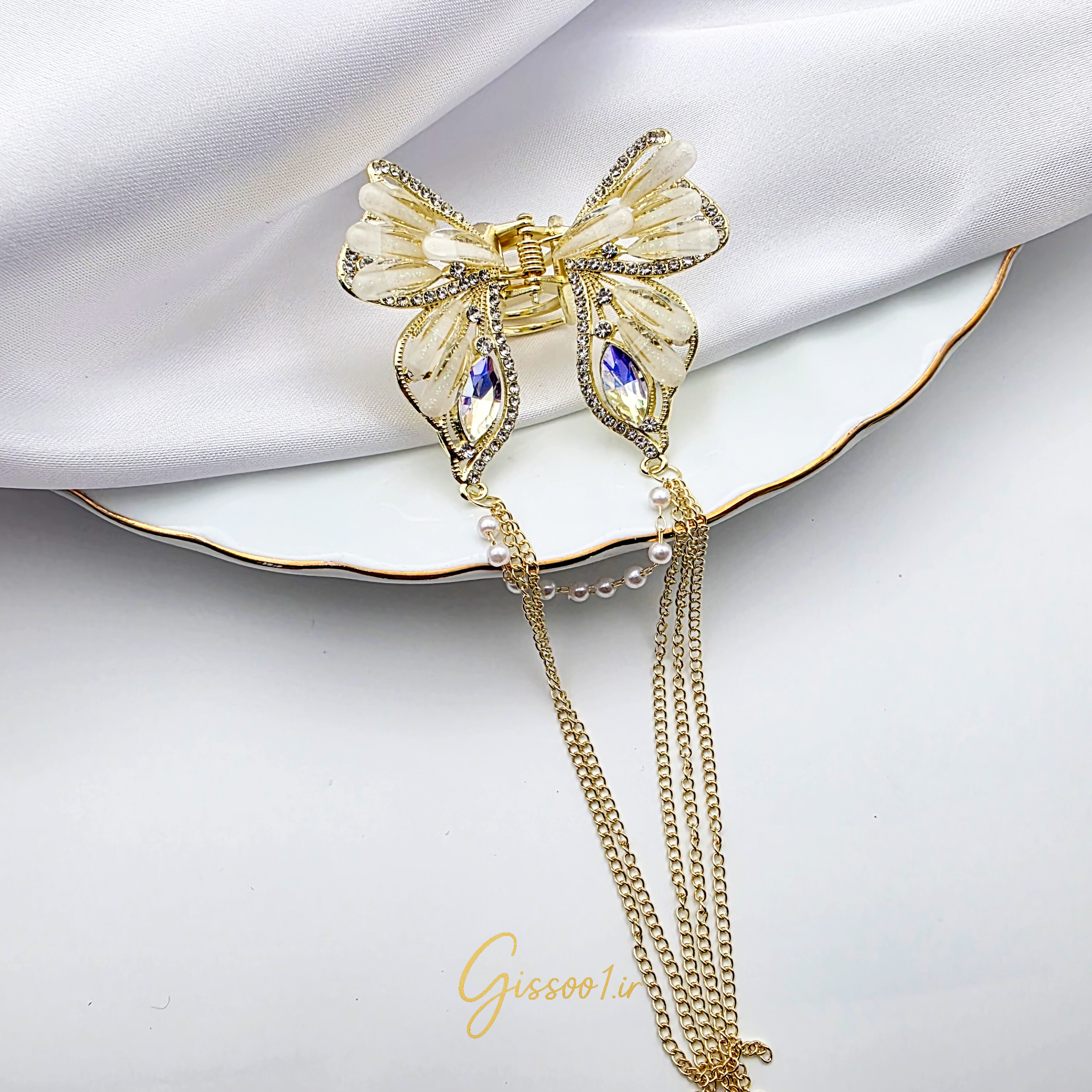 اگر به دنبال اکسسوریای هستید که هم زیبایی و هم کارایی را در کنار هم داشته باشد، این کلیپس پروانهای طلایی با آویز مرواریدی، انتخابی بینقص برای شماست.
