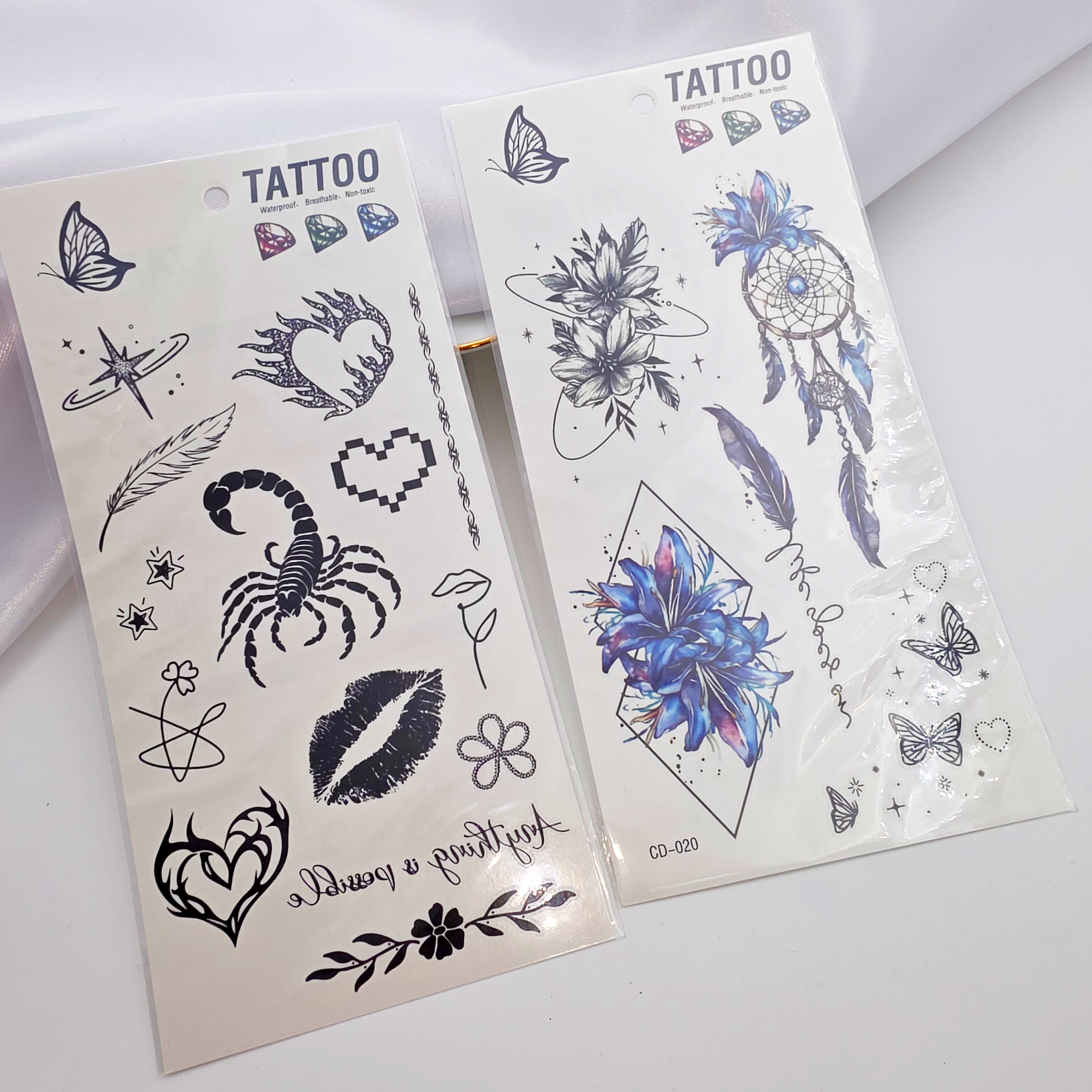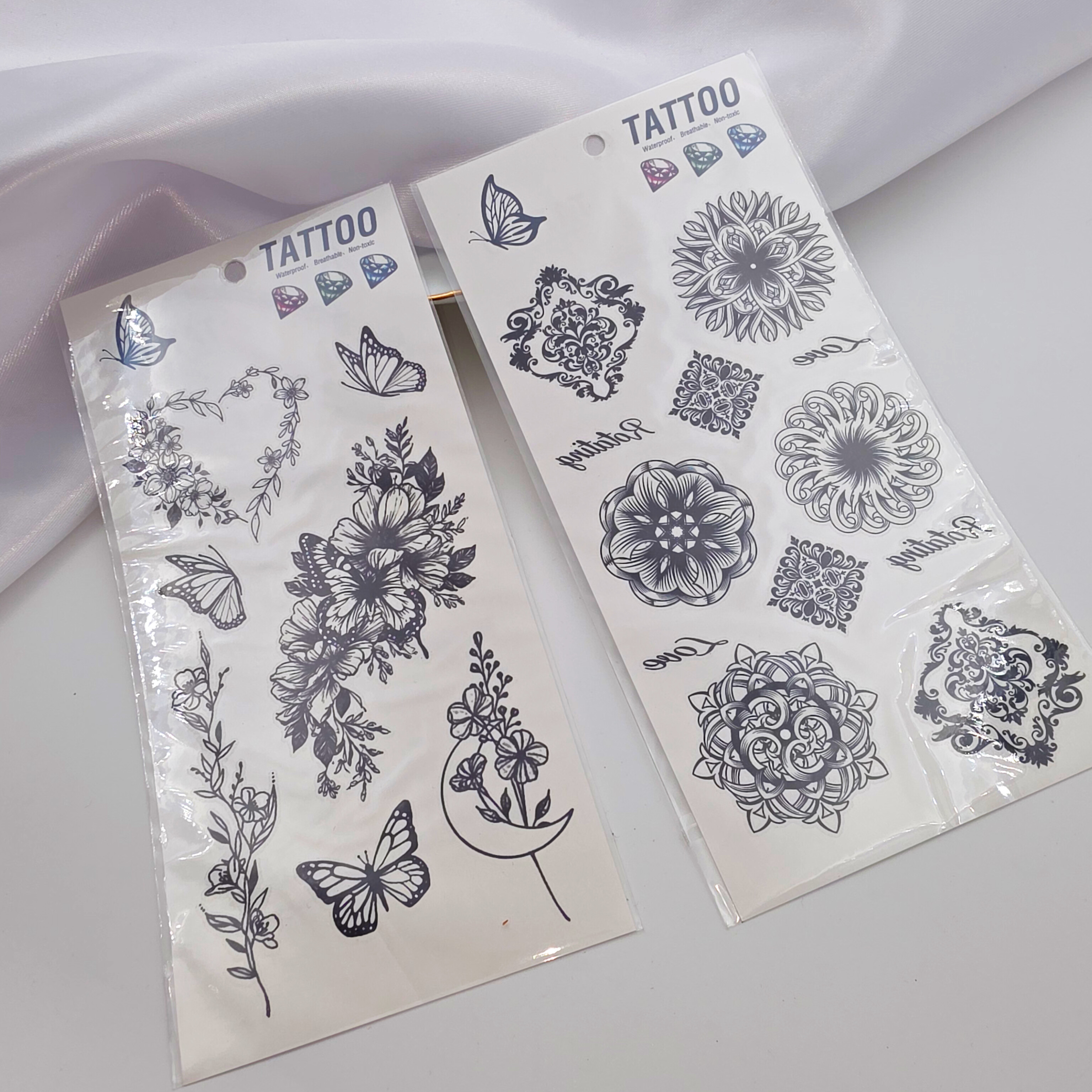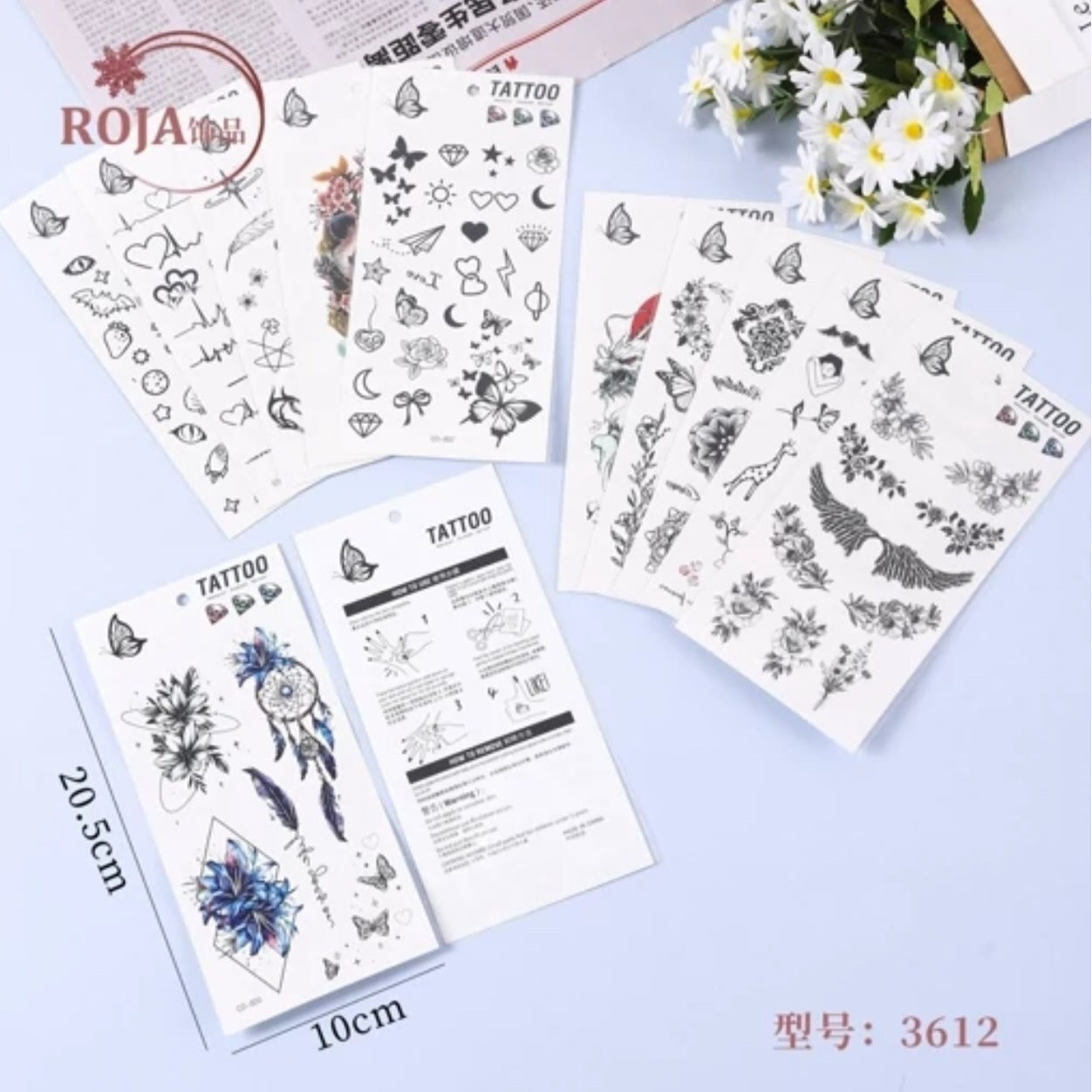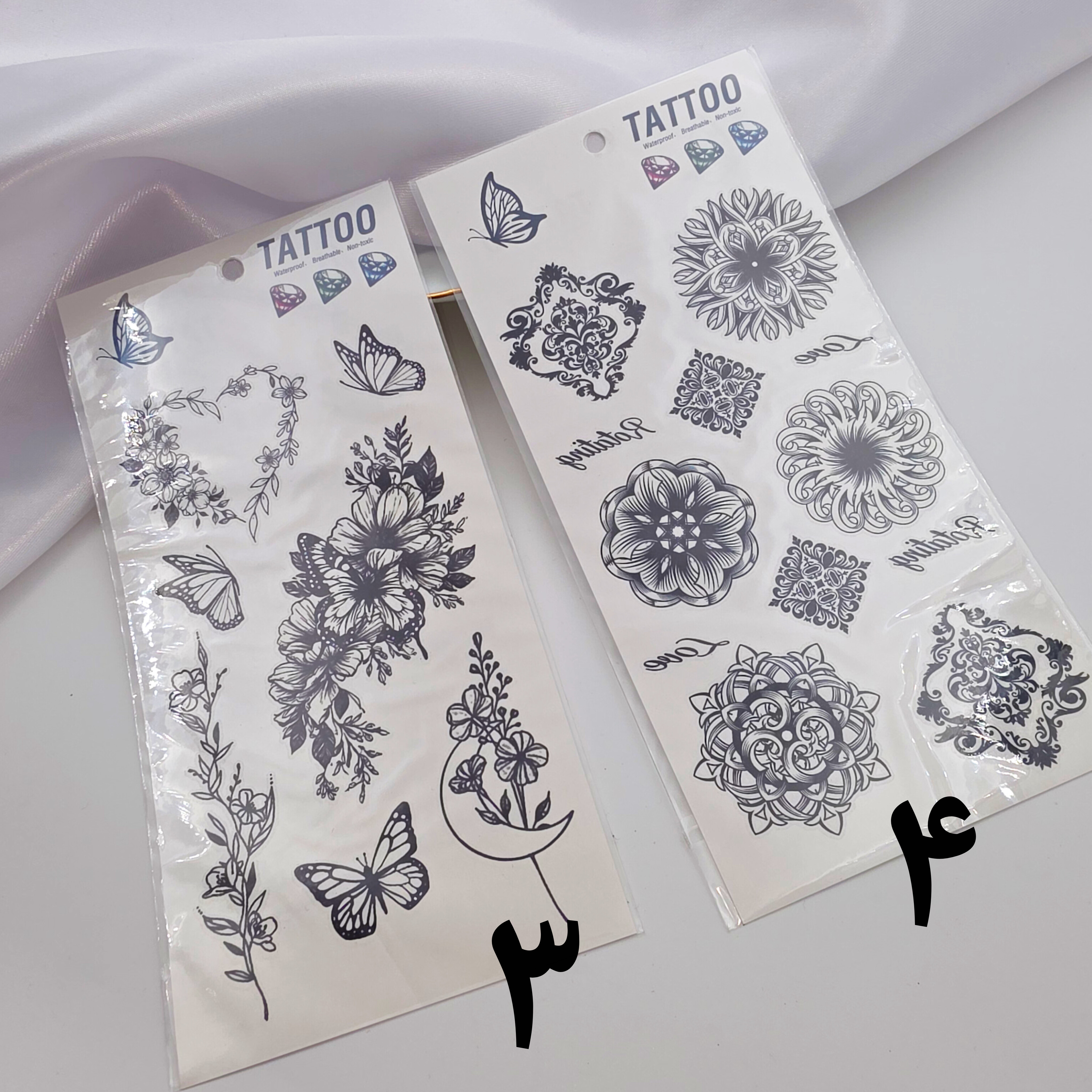 تتو موقت برچسبی که به راحتی با کمی آب به پوست تتو می شود ماندگاری دو الی سه روز با ریختن آب معمولی پاک نمیشه فقط با ساییدن و شستشو با لیف محو میشه
